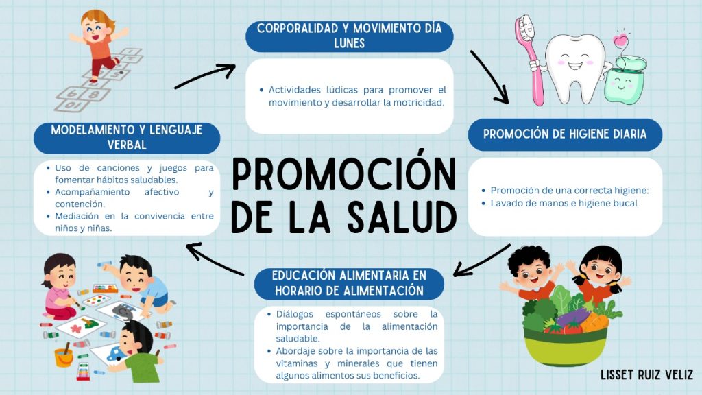 Como estudiante en práctica profesional, diseñé e implementé diversas experiencias pedagógicas orientadas a fortalecer la mención de Promoción de la Salud, integrándolas de manera intencionada en la rutina diaria del nivel. Las actividades estuvieron centradas en promover la higiene bucal, fomentar una vida activa y resaltar la importancia del juego en el bienestar físico, emocional y social de los niños y niñas. Estas instancias se desarrollaron en contextos cotidianos, como momentos de higiene, alimentación y juego libre, permitiendo trabajar hábitos saludables de forma significativa y cercana a la realidad de los párvulos. Esta experiencia me permitió consolidar mi compromiso con la generación de ambientes educativos que favorezcan el desarrollo integral de niños y niñas.