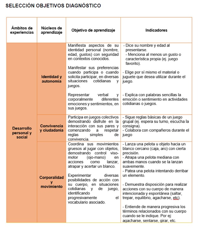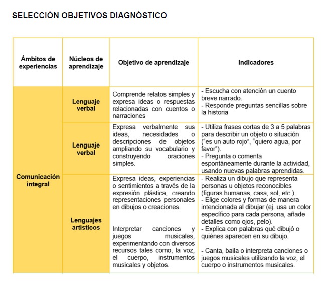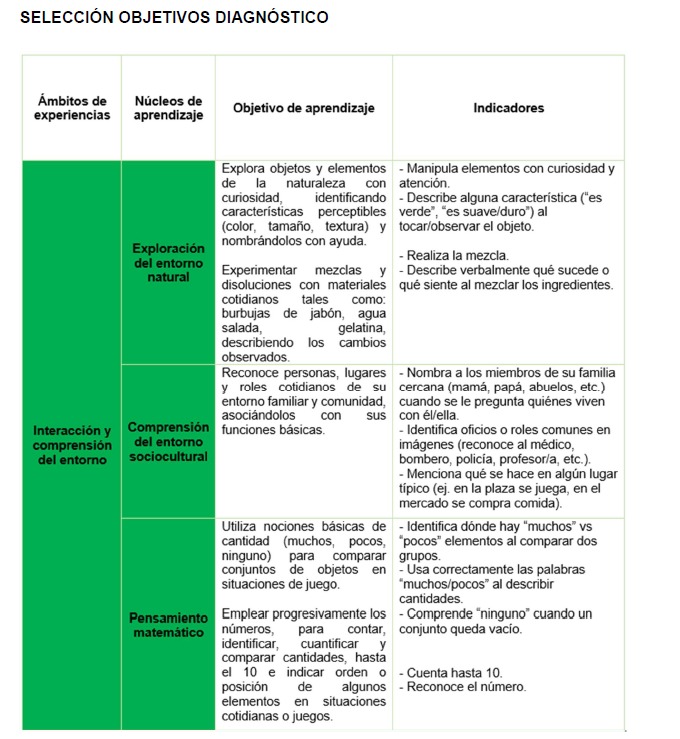 Para la elaboración del diagnóstico del nivel, se llevó a cabo una serie de evaluaciones utilizando diversos instrumentos de recogida de información, con el fin de obtener una visión integral del grupo de niños y niñas. Entre las estrategias aplicadas se incluyó una entrevista a la Educadora de aula, lo que permitió conocer su percepción respecto al desarrollo, intereses y necesidades del grupo. Además, se aplicó un cuestionario dirigido a las familias, que proporcionó antecedentes relevantes sobre el contexto familiar y características individuales de los párvulos. Se realizaron también observaciones directas y evaluaciones durante las rutinas y momentos de juego planificados y espontáneos, lo que permitió recoger información sobre sus intereses, interacciones y habilidades de niños y niñas. Finalmente, se sostuvieron reuniones informales con el equipo educativo, lo que favoreció el intercambio de experiencias y la construcción conjunta de una mirada más amplia y contextualizada del grupo.