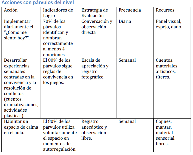 – Diseñar e implementar experiencias de aprendizaje significativas para los niños y niñas, que favorezcan la convivencia, la expresión y regulación de emociones, fortaleciendo un ambiente afectivo y respetuoso.
