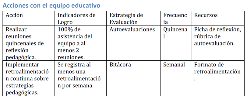 – Promover instancias de reflexión y autoevaluación continua en el equipo educativo, con el fin de enriquecer el quehacer pedagógico, fomentar una comunicación asertiva que fortalezca el trabajo colaborativo y la implementación de mejoras en el aula.